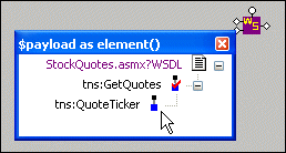 The payload input port for the ddtek:wscall function describes the data the Web service requires in order to execute the SOAP action. This port is on all ddtek:wscall function blocks. (It is the second input port for functions added to XQuery Mapper using the wscall/2 menu choice. It is the third input port if you used the wscall/3 menu choice.)