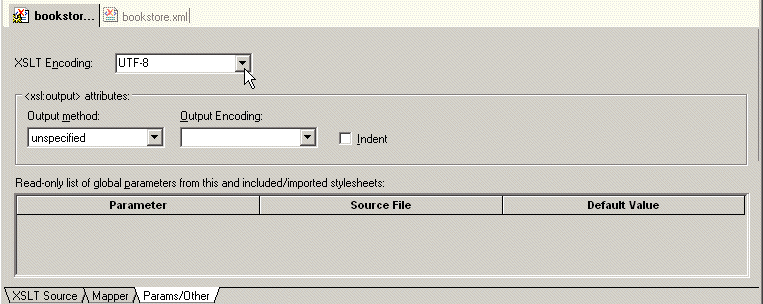 In the Params/Other tab, in the Output Encoding field, you can specify the encoding you want Stylus Studio to use in the document that is the result of applying the stylesheet. When you apply a stylesheet, Stylus Studio uses this encoding for the output document. You can change the encoding by changing the setting in the Params/Other tab or in the initial processing instruction in the stylesheet. When you change the setting in one of these places, Stylus Studio automatically changes it in the other. They are always the same. In the Output Encoding field, click the down arrow to display a list of the supported encodings.