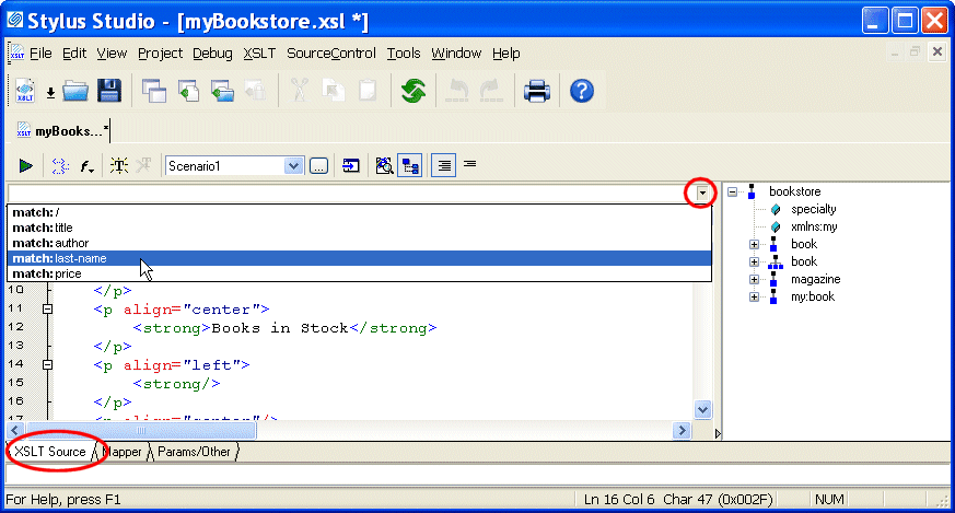 Stylus Studio displays a drop-down list of the first five match patterns in the stylesheet. To limit the displayed list, type in the combo box to the left of the down arrow. Stylus Studio displays only those patterns that match the character(s) you typed.