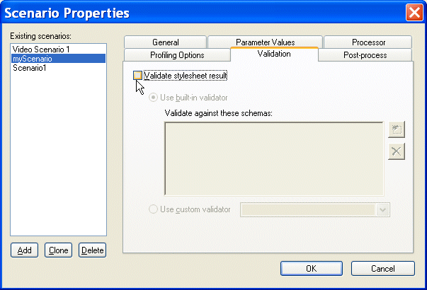2. In the XSLT Editor (XSLT Source or Mapper tabs), in the scenario name field, click the down arrow and click the name of the scenario for which you want to perform validation.