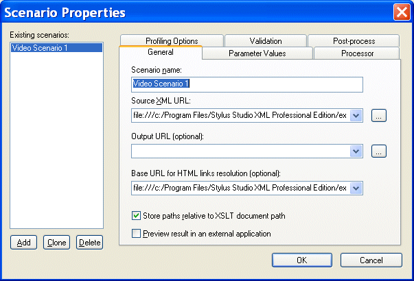 The main benefit of the XSLT scenario feature is that it lets you specify the XML document against which you want to run your XSLT. By default, Stylus Studio uses the first source document you add using the XSLT mapper as the XML source document for the scenario. You can specify the XML source document setting on the General tab of the Scenario Properties dialog box.