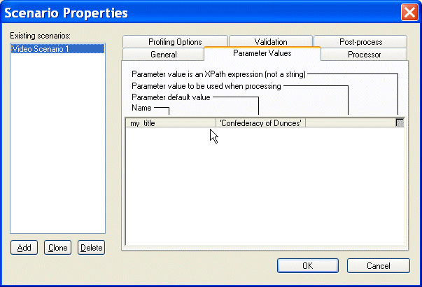 The Parameter Values tab of the Scenario Properties dialog box displays any global parameters you have defined in the XSLT source and allows you to