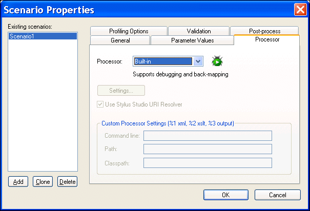 By default, Stylus Studio uses a built-in processor to process XSLT documents. You can change the processor on the Processor tab of the Scenario Properties dialog box.