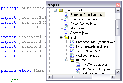 After having generated the Java XML bindings for you, <%= ConfigurationManager.AppSettings["SSVXE"] %> will next prompt you to optionally add the generated JAXB files (.zip file, 76 KB) to your <%=ConfigurationManager.AppSettings["SS"]%> project. In the following illustration, the Java XML binding classes are shown in the <%=ConfigurationManager.AppSettings["SS"]%> XML Project window. In the background you can see the JAXB code being viewed using the built-in Java IDE.