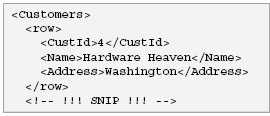 These mappings can be parameterized in several ways, including the target namespace for the result, whether to handle nulls using xsi:nil or absence, and whether to map a table to a single element or a forest of elements. Here is an XML representation of the Customers table shown earlier, using a single element for each table and no target namespace: