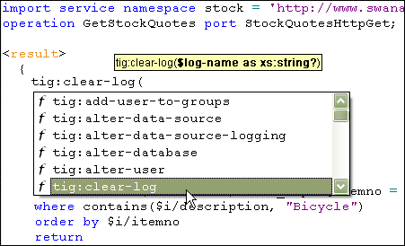 <%= ConfigurationManager.AppSettings["SSVXE"] %> fully supports all TigerLogic XDMS XQuery extension functions, in addition to supporting the XQuery and Web service extensions described previously. An example of the TigerLogic XDMS XQuery code completion and syntax help features is illustrated here: