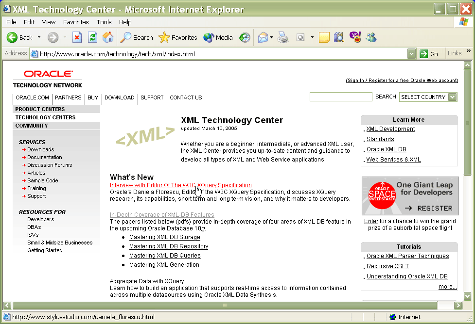 more >The Oracle Technology Network (OTN) XML Technology Center picks-up a recent article with Dr. Daniela Florescu, on the short and long term vision for XQuery. The article was produced by, and featured in 'The Stylus Scoop', the official newsletter of the <%=ConfigurationManager.AppSettings["SS"]%> XML developer community.